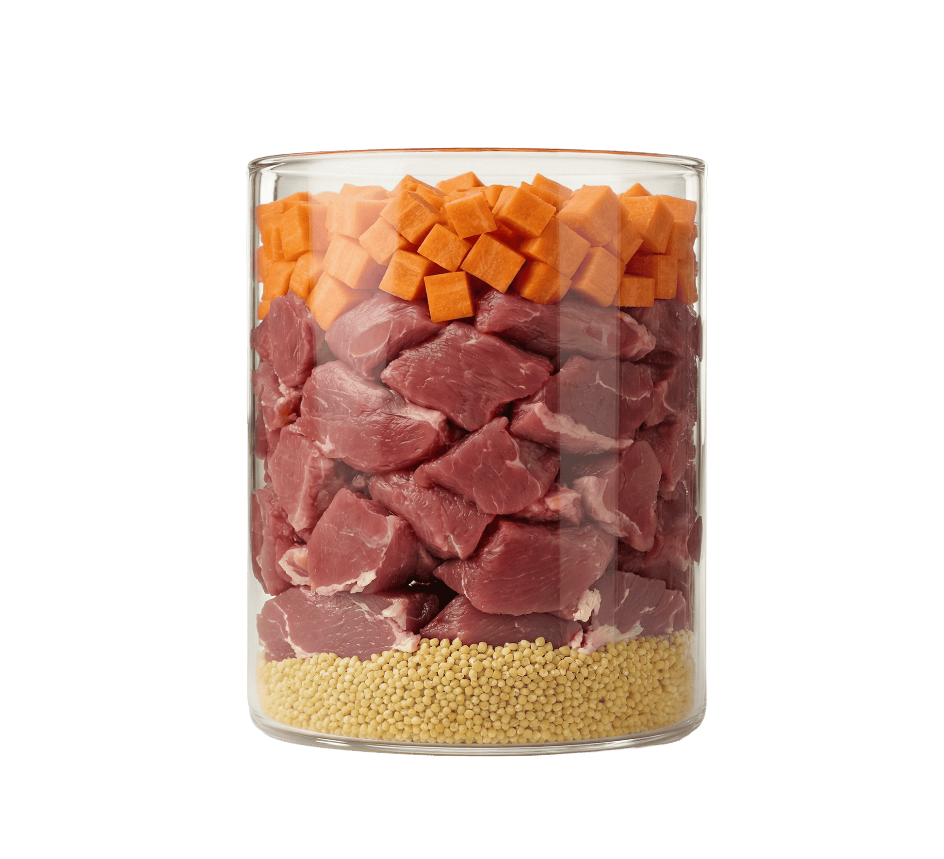 Natürlich. Hochwertig. Echt. Unser Nassfutter vereint traditionelle Rezepturen mit modernem Anspruch. Ente, Karotten und Hirse – mehr braucht es nicht, um deinem Hund das Beste zu bieten. Jede Zutat hat ihren Platz, jeder Bissen ein Grund zur Freude.