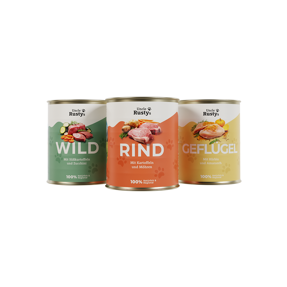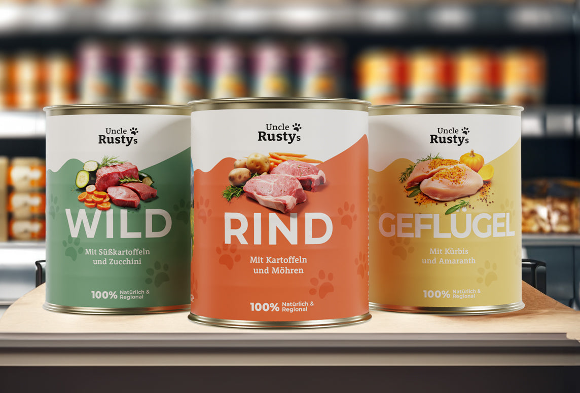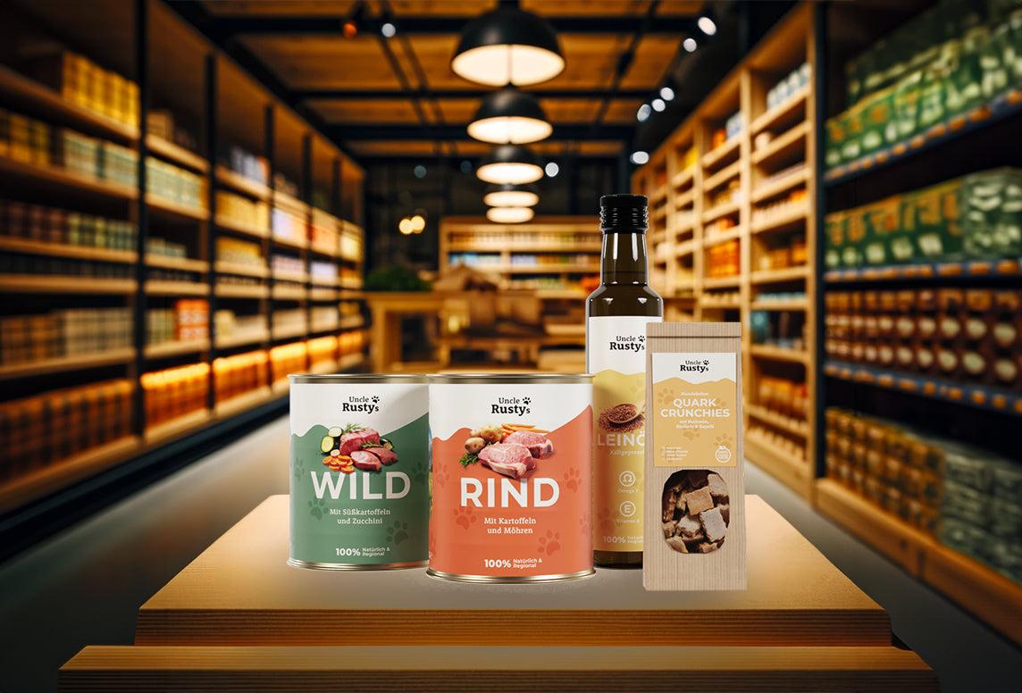 Partner mit Uncle Rusty's für Top Nassnahrung und Snacks für Hunde. Wir bieten: