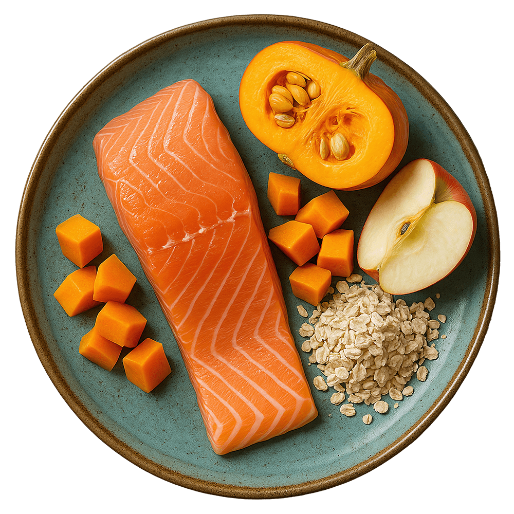 Natürlich. Hochwertig. Echt. Unser Nassfutter vereint traditionelle Rezepturen mit modernem Anspruch. Lachs, Kürbis, Haferkleie und Apfel – mehr braucht es nicht, um deinem Hund das Beste zu bieten. Jede Zutat hat ihren Platz, jeder Bissen ein Grund zur Freude.
