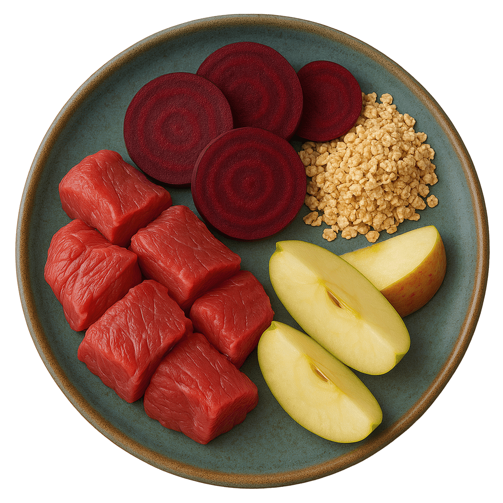 Natürlich. Hochwertig. Echt. Unser Nassfutter vereint traditionelle Rezepturen mit modernem Anspruch. Lamm, Rote Beete, Haferkleie und Apfel – mehr braucht es nicht, um deinem Hund das Beste zu bieten. Jede Zutat hat ihren Platz, jeder Bissen ein Grund zur Freude.