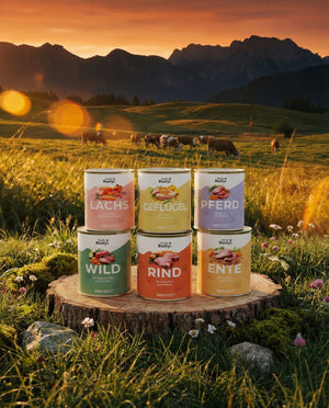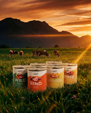 Als Richtwert gilt: ca. 2–3% des Körpergewichts pro Tag. Ein 10 kg schwerer Hund bekommt also ca. 200–300g täglich. Auf jeder Dose findest du eine detaillierte Fütterungsempfehlung nach Körpergewicht. Junghunde und sehr aktive Hunde brauchen etwas mehr.